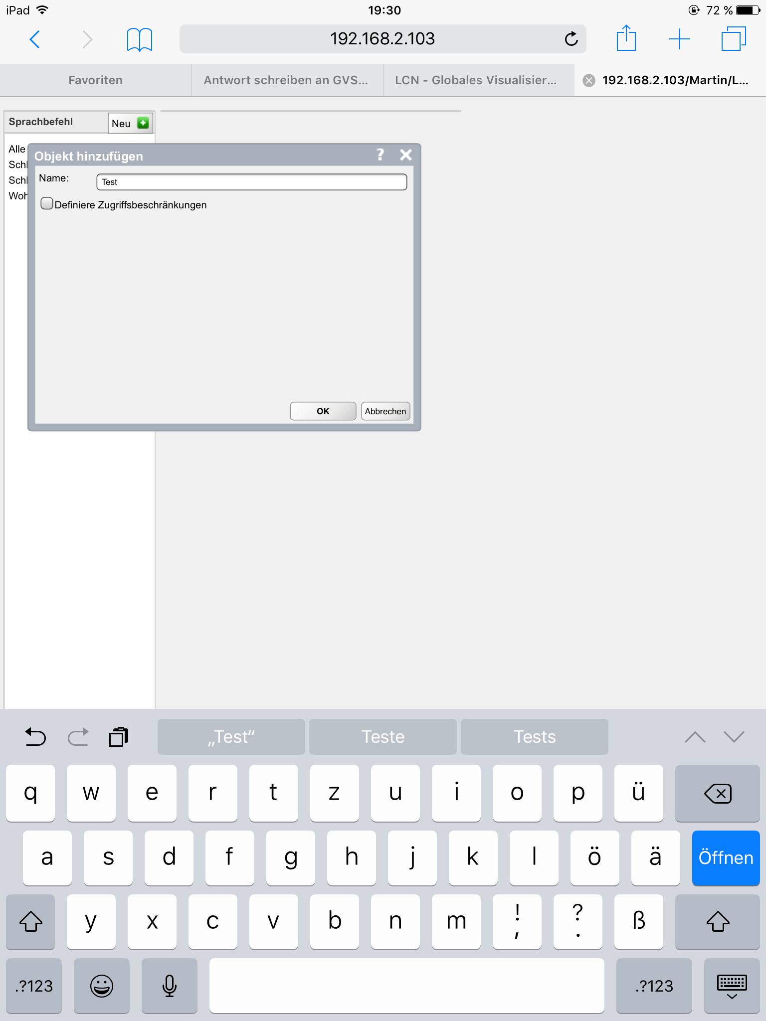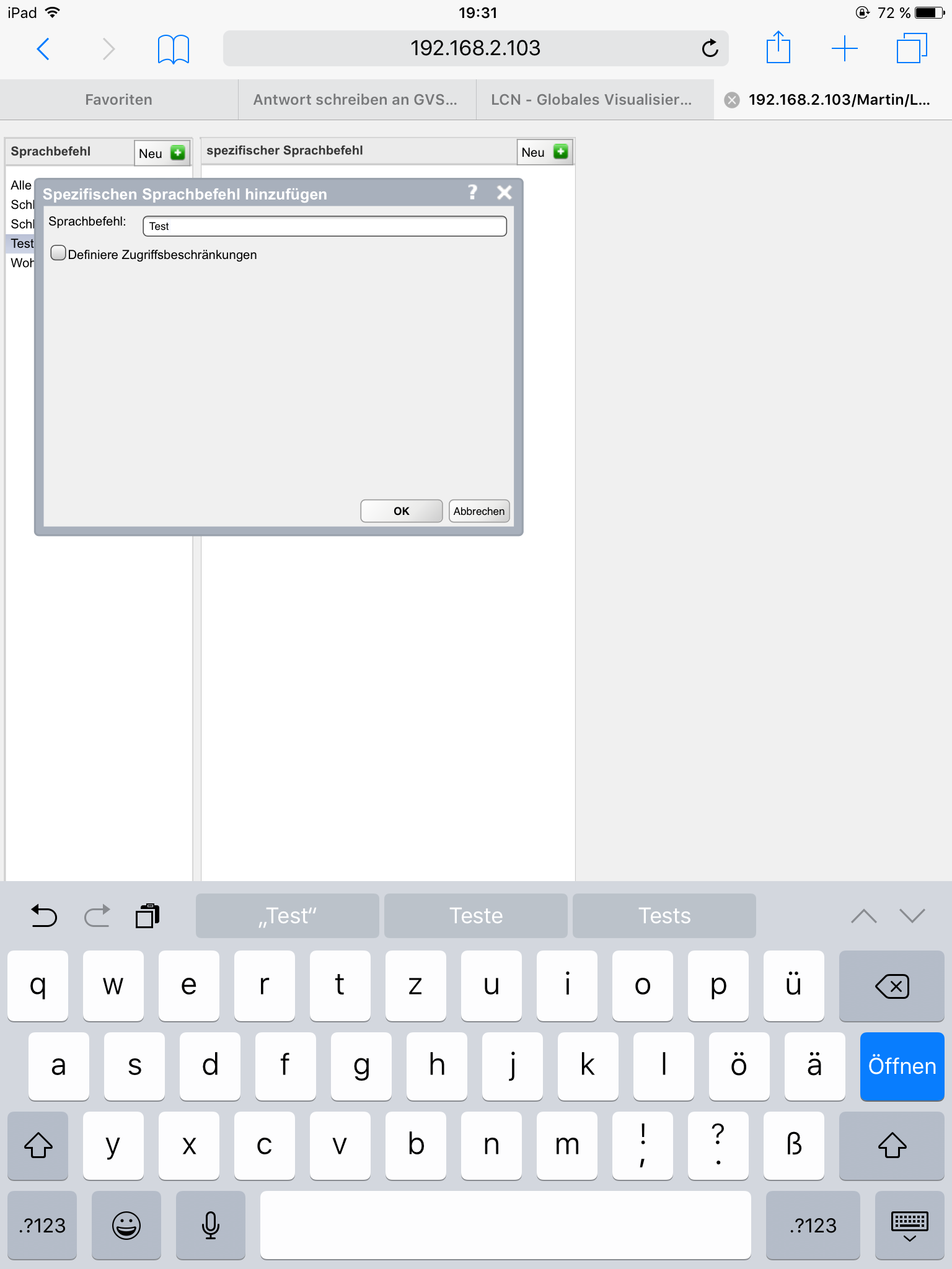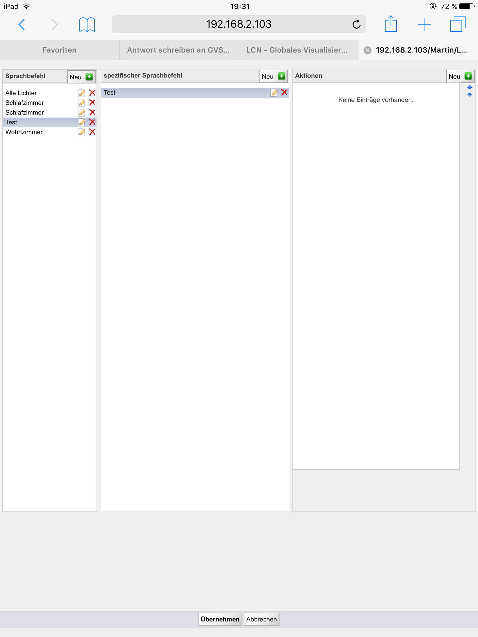 RE: GVS mit Siri - Martin - 10.06.2018 Ich habe unter Sprachbefehl einen Befehl eingegeben, dann geht rechts ein Feld auf mit spezifischen Sprachbefehl dort musst du auf "neu" klicken und dann wieder einen Befehl ins Feld schreiben, dann kannst du die Aktion festlegen. Ich habe mal Bilder von einem "Test Befehl" angehängt! RE: GVS mit Siri - Tobias_8079 - 10.06.2018 Hmm, bei mir wird das irgendwie komplett anders dargestellt, warum auch immer.... Nicht nebeneinander sonder untereinander, und die ganzen + fehlen auch. Sieht so aus wie beim ersten forumsbeitrag... RE: GVS mit Siri - LCNJürgen - 10.06.2018 Hm eine Frage in die Runde, wer hat genau die 8€ kostende LCN GVS Siri gekauft das dass alles gehen soll!? RE: GVS mit Siri - BK - 11.06.2018 Beim Testen und nachem Änderungen an der Konfig. gemacht wurden, muss das Kommando "Update", mittels Siri an die LCN-Siri App schicken. Erst dann sind die letzten Änderungen verfügbar. Beispiel der Sprachnachicht: "LCN Nachricht Update." RE: GVS mit Siri - Ben - 11.06.2018 Bzgl. Update habe ich die Erfahrung gemacht dass es ausreicht einmal die App neu zu starten und wieder zu schliessen nachdem man Änderungen gemacht hat, dann kennt Siri die Änderungen. @Tobias_8079: Die Darstellung bzw. Handhabung ist in definiftiv unschön. Ich nutze den Firefox und das Problem ist dass man immer das Menü verlassen und wieder aufrufen muss damit man einen weiteren Sprachbefehl anlegen kann. Der zuletzt angelegte Sprachbefehl bleibt immer markiert, so dass man wenn man auf neu geht immer nur einen "spezifischen Sprachbefehl" dazu anlegen kann anstatt einen weiteren "Sprachbefehl". |