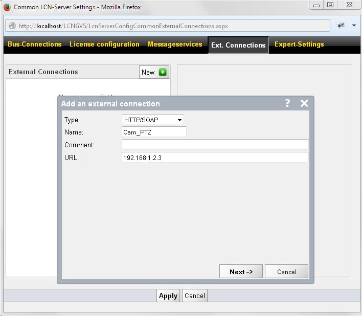 IP CAM PTZ commands - Adam - 14.01.2015 Hello, One question about control IP camera and send PTZ command. Now I create built-in web/panel in a table/projection (created site) and can see picture from IPcam. Ok, on the next step I want to use PTZ commands and put buttons (up,down,right,left) to my table/projection next to built-on web/panel with image from IPcam. I try to use "add" -> "control from browser" -> "from reference image(button)" -> "URL" and put PTZ command. Now I have problem because if I push the button its redirected http and cleaning current view(please see at attachment). Which command from menu allows to send http string without redirect - I can not find such command. I try to use "send/run command" -> "macro" but in a macro option there is only creator which imposes the use of LCN modules. I want to watch streaming video and control cam head from buttons. RE: IP CAM PTZ commands - HSZ - 14.01.2015 Hello, yes, with the Button control from browser, a new Site opend, if clicked.We think, you schould use a Ext. Connection - First, go to setup, -> Ext. Connections and create a connection from type HTTP/SOAP - Set a name(e.g. Cam_ptz) and the adress of the cam, like this: In the next step, create a macro. Choose action HTTP / SOAP - Adam - 14.01.2015 Thank you for fast feedback, working ok. |