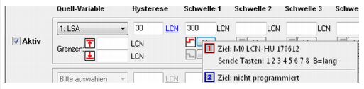 Selbstverständlich ist es möglich, mehrere Schwellwerte gleich zu belegen. Da der LCN-LSA an einem neuen Modul betrieben wird, lassen sich natürlich schon einmal die 4 Schwellwerte eines Registers benutzen und so bis zu 8 Befehle ausführen. Sollte das nicht reichen, lässt sich der LCN-LSA auch bei den anderen 3 Registern als Quelle einstellen, wir kommen so auf 4*4*2 = 32 Befehle.
