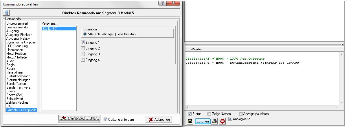 Anschlussperipherie, BU4L (S0) Eingang 1" ausgelesen und im Busmonitor