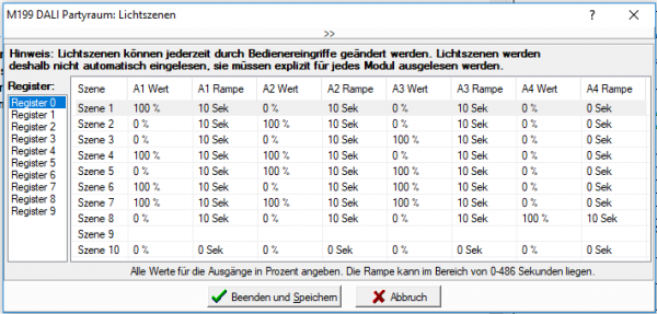 - Die Lichtszenen werden nur beim Überschreiten des Schwellwertes 9, Null gestellt und +1 addiert.