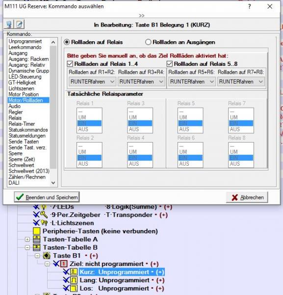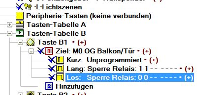 Auf einer Taste der Tabelle B habe ich nun jeweils um alle Rollos gleichzeitig anzusprechen ein Taste programmiert die über den Befehl Taste Senden die Tasten A zum Hochfahren bzw. die Tasten A zum Runterfahren auslösen soll (Windsteuerung bzw. Sonnenschutz).